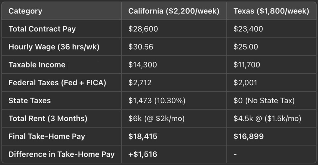 Imagine two contracts: One in California paying $2,200/week, and another in Texas paying $1,800/week—both with half as a tax-free stipend. California has higher state taxes and rent, while Texas has no state income tax but a lower weekly rate. Here’s how they compare over a 13-week contract: